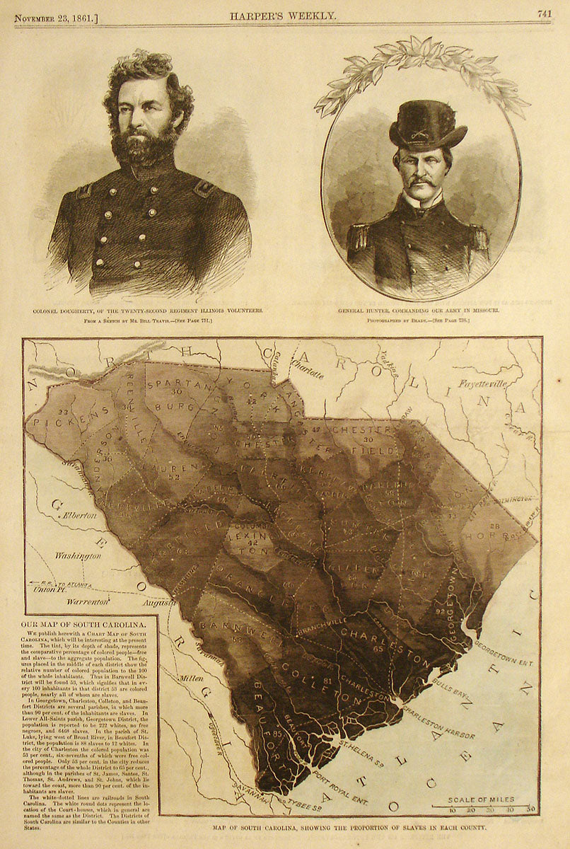 South Carolina was the first to secede in Dec of 1860, born of the concern over Lincoln's election and the potential abolition of slavery. This map issued in November of 1861, just as US forces were blockading the ports of the state, shows the density of slavery throughout the area. The darker the region the worse the slave concentration, a number in the center of each county gives specific range, such as "thus in Barnwell District will be found 53, which signifies that in every 100 inhabitants... 53 are colored people, nearly all of whom are slaves."