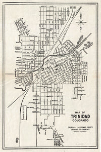 (CO.-Trinidad) Map Of Trinidad Colorado, Anon.-Chamber of Commerce, c. 1959 It's a wonderful old town in southern Colorado that was founded by in 1862, and it has grown and evolved over the years to be a be a unique spot. Here a map of the town grid and key points of interests as it was toward the late 1950's. In the years that followed one of the early hippie communes would settle just a few miles north of town, but more notably it would become the sex change capital of the world thanks to the pioneering Dr Stanley Biber. Condition is very good. Image size is approximately 13 x 8.25 (inches)