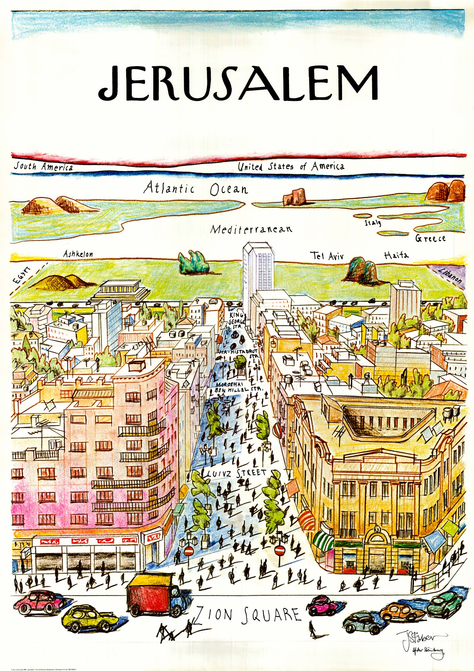 A great new take for the ancient city. Centered on Zion Square where everything is proportionate and logical, but once you are past King George Station it stretches into a Mediterranean that looks like a pond, and just the U.S. and South America on the horizon. Another fine instance of J. Staber's use of the Steinberg projection, and includes his attribution after his name which says, "After Steinberg". Condition is very good, almost excellent. Overall image size is approximately 34 x 24 (inches) $85.00