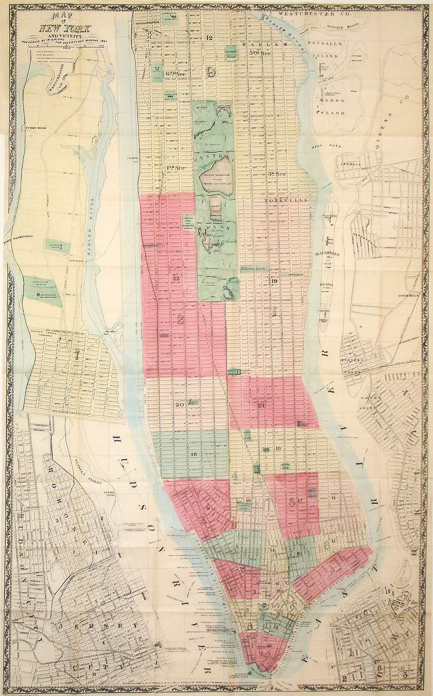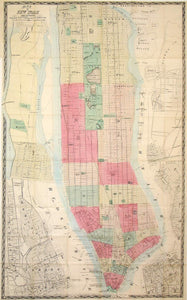 A large and dramatic map for NYC, with bold original hand color and a surrounding decorative border. Reaching from 133rd street, down to the Battery, it is divided by ward, and includes all the parks throughout. Many of the docks are identified by compmany or route, and ferry lines abound from almost all points around the city's coast. Includes the grid and streets of neighboring Brooklyn, Hoboken and Jersey City. A large inset completes the island of Manhattan from 135th up to Westchester County.