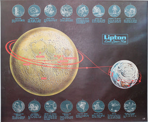 A celebratory promotional map of the expedition of the Apollo astronauts to make the lunar landing a reality. Tracing out step by step each stage of the flight, starting from launch at Cape Kenndey and through the landing, "hopping on the moon", to "talking with the President", "tumbling for re-entry", "pick-up", and the "future colonies on the moon". A concise image for the complex orbits and topography that was part of this important moment.