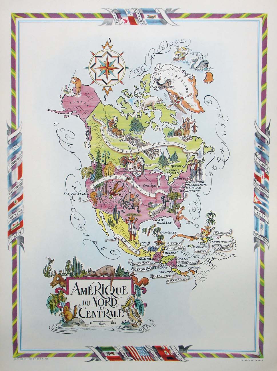 Jacques Liozu's maps are a post war breath of fresh air, and are pervaded with a simplicity and decorative lightness that is interesting but also attractive. This map shows the full extent of the continent from Central America, up to the Arctic Sea. Full of vignettes for local culture, and surrounded with a decorative border that includes the flags of many nations. Colorful and rare.