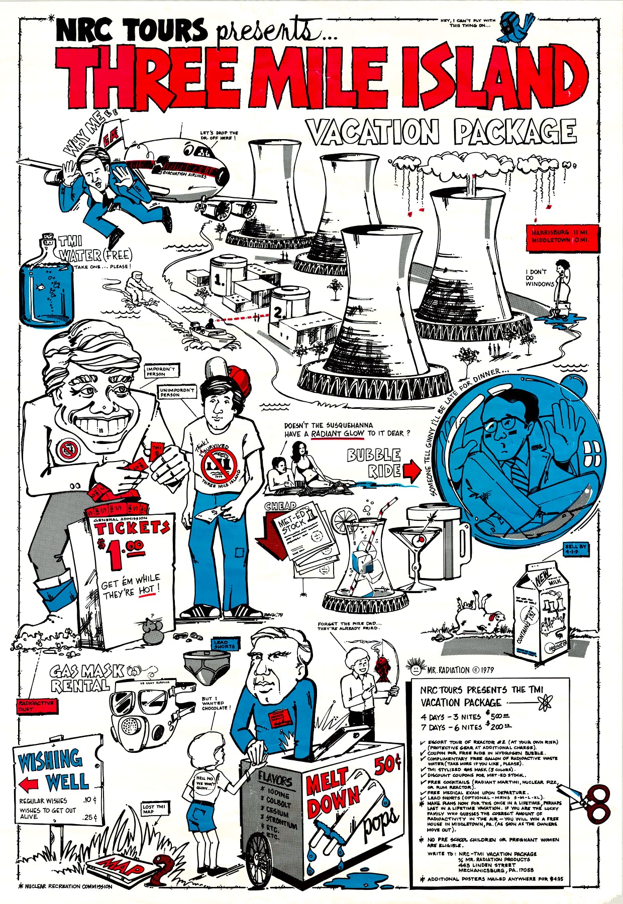 It was the partial meltdown, that was spawned by a stuck valve and user error. And while the radioactive output was minimal, it brought this invisible energy world to the public and changed opinion. With the just post accident chaotic atmosphere, here a local character, "Mr Radiation", created the idea of tours lampooning the event and key people involved. A scarce ephemeral image that catches the shifting public perception.