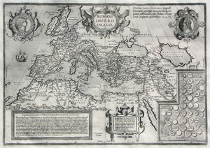 A classic image of the Empire by one of the great cartographers, Ortelius. Spans from Scotland and the north of Africa, east to Egypt, the Caucuses, and Babylonia and the Persian Gulf. A large inset gives the history and succession of the Emperors as well as several cartouches pertaining to the kings. A handsome engraving